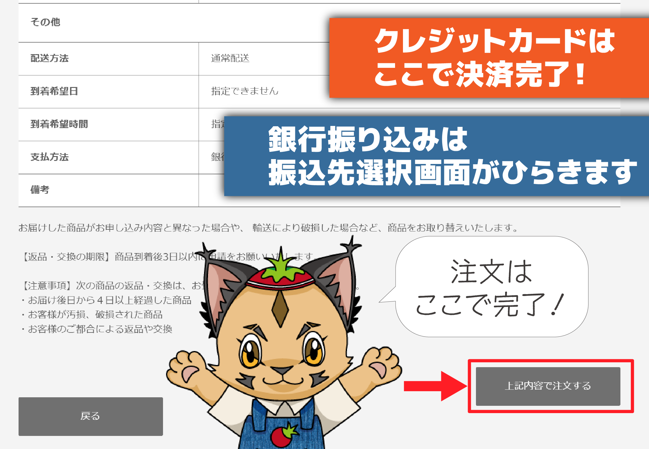 クレジットカード決済を選んだ場合は、ここで「上記内容で注文する」を押すと決済が行われ購入されます。