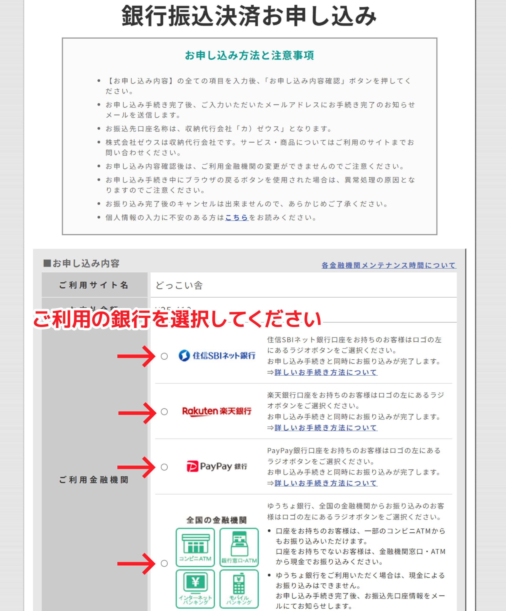 銀行振り込みを選んだ場合は、「(決済代行)ゼウス」の銀行振込ページが開きます。